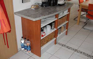 Die Kirschbaumoptik bzw. Hochglanz weiße Flächen passen zur übrigen Kücheneinrichtung.